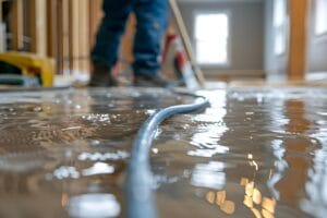 Person standing in floodwater indoors wearing green rubber boots and jeans.